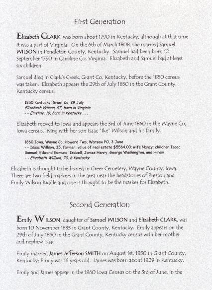 Emily WILSON, daughter of Samuel WILSON and Elizabeth CLARK, was born 10 November 1833 in Grant County, Kentucky. Emily appears on the 29th of July 1850 in the Grant County, Kentucky census with her mother and nephew Isaac.